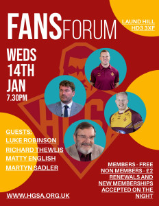 Our very popular Fans forum is this coming Wednesday at 7.30pm up at Laund Hill Community Sports Park.